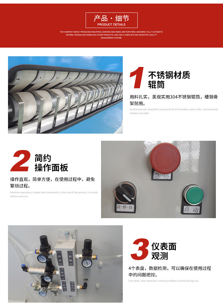 燙平機采用不銹鋼烘筒加熱,散熱效率高,表面光潔平整,熨燙效果好。燙平機特有石墨密封旋轉接頭,保證密封性能。燙平機熨燙速度無級調速,結構合理,達到靜音效果。燙平機采用疏水系統,提高熱效率,降低使用成本。 燙平機變頻調速系統,節能、高效、平穩,齒輪鏈條傳動系統,工作可靠,噪音低。燙平機配以專業生產廠家的熨燙錠帶,變形小,壽命長,熨痕小。燙平機外接蒸氣和電加熱多種機型可供選擇。